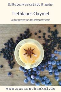 Ich habe für das tiefblaue Oxymel (Sauerhonig) verschiedene dunkle Beeren kombiniert. Du kannst das Rezept gerne abwandeln und die Beeren verwenden, die du zur Verfügung hast. In meinen Vorräten hatte ich noch ein paar Schlehen und Blaubeeren (im Tiefkühler) sowie Holundersaft. Wenn du Blaubeeren verwendest, solltest du darauf achten, dass du eine Sorte benutzt, die wirklich stark färbt. Typisch für ein Oxymel ist der Auszug in Essig und Honig. Hier habe ich Balsamico-Essig wegen der dunklen Farbe gewählt. Weil ich das Oxymel gleich verwenden wollte, habe ich es abgekocht, anstatt es einen Mond lang ziehen zu lassen.